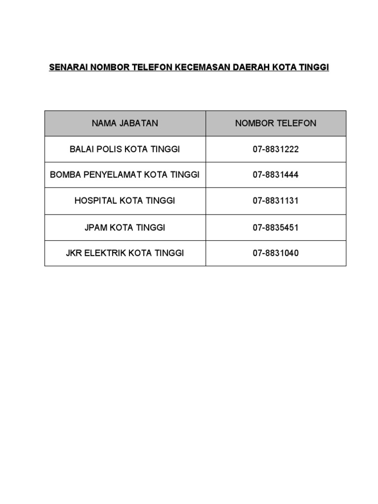 Senarai Nombor Telefon Kecemasan Daerah Kota Tinggi Pdf